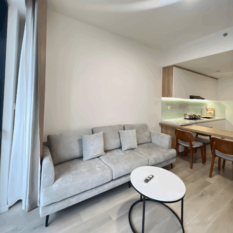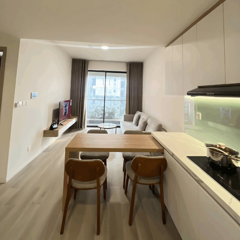 Bàn ăn liền bếp gỗ công nghiệp cao cấp, ghế bọc nệm xám mang lại cảm giác ấm cúng và thanh lịch, phù hợp với tinh thần Lumière Boulevard Quận 9.