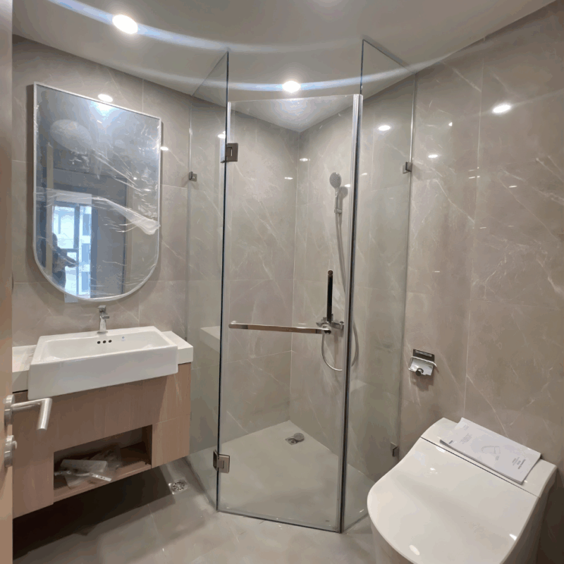 Hệ tủ phẳng, mặt đá vân mây trắng kết hợp kính ốp xanh mint tạo điểm nhấn tinh tế.