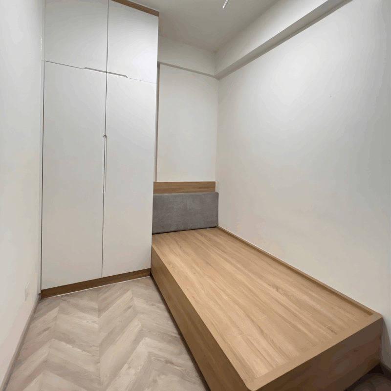 Phòng ngủ master được thiết kế tối giản và tinh gọn, kết hợp tông trắng – gỗ sáng mang lại cảm giác ấm áp và thoáng đãng.